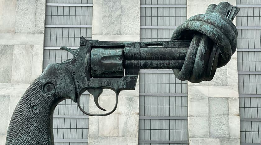 „Non-Violence“: Ein übergroßer Colt Python .357 Magnum Revolver mit verknotetem Lauf. Eine Bronzeskulptur des schwedischen Künstlers Carl Fredrik Reuterswärd vor dem UN‑Gebäude in New York/USA. Bild von Maria Lysenko auf Unsplash