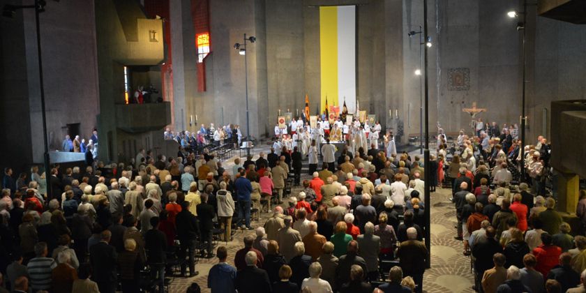 Das Weihejubiläum erinnerte an die architektonische Bedeutung des Bauwerks und die 50 Jahre, in denen ungezählte Pilger in dieser Kirche Trost und Segen erfuhren. So freuten sich die Franziskaner, dass der Kölner Erzbischof Rainer Maria Kardinal Woelki seine Teilnahme zugesagt hatte. Am 10. Mai, dem diesjährigen Himmelfahrtstag, hielt er das Pontifikalamt im Mariendom, der zweitgrößten Kirche des Erzbistums. Am folgenden Sonntag feierte Bruder Franz Josef Kröger die Eucharistie mit den zahlreichen Pilgern. Er vertrat Bruder Cornelius Bohl, den Leiter der Deutschen Franziskanerprovinz, der wegen einer Auslandsreise verhindert war.